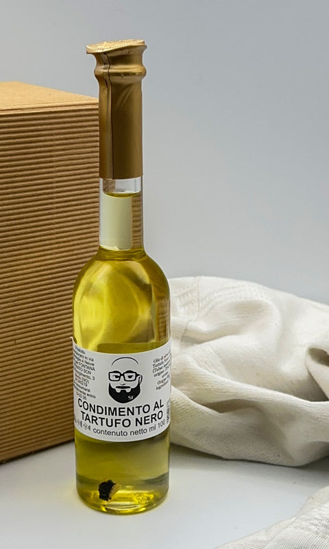 Questo è un olio d'oliva aromatizzato con il Tartufo Nero (Tuber Aestivum Vitt), detto anche Scorzone, è un condimento dal gusto caratteristico pieno e terraceo.